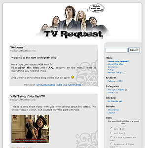 NO TRANSLATION AVAILABLE HIM MANIA стартира нов проект! Казва се HIM TV Request и от него ще може да поръчвате ТВ записи свързани с HIM. Адресът е http://himmania.com/tvrequest/ Колкото до групата - нищо ново около нея. В момента са на турне в Европа, а във форума ще намерите купища снимки от него. Виле отново изглежда както по времето на Deep Shadows And Brilliant Highlights ;) И все пак ако нямате достъп до снимките във форума натиснете ТУК и ТУК. Виле спечели първо място в категорията `Най-добър вокалист` на наградите Metal from Finland. А Venus Doom e на първо място в категория `Най-добър албум` за 2007. Повече инфо от ТУК. Доста от вас сигурно са забелязали, че от 10 дни насам анкетата е сменена с нов въпрос, а именно дали ви харесва новото видео - Bleed Well. |
